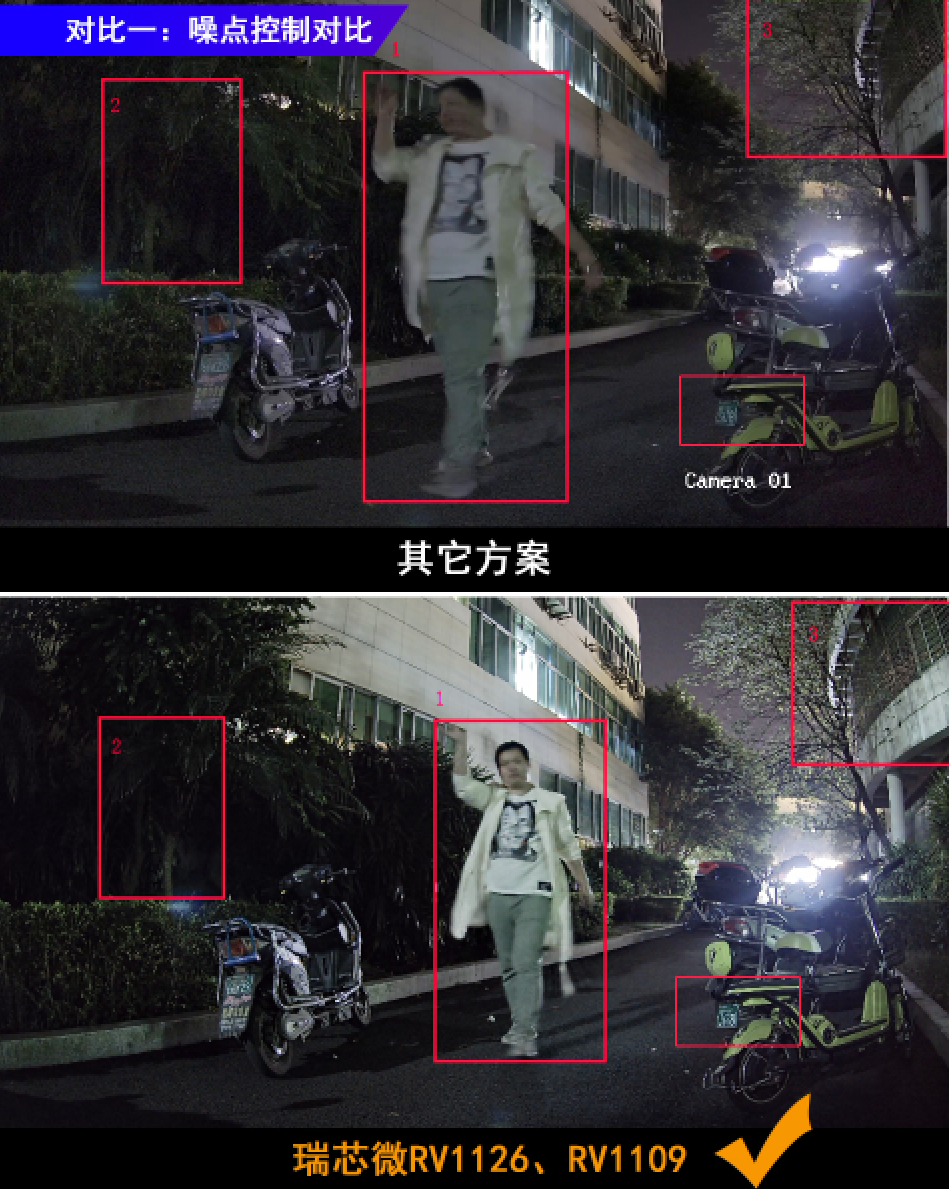 基于RV1126及RV1109方案的多級降噪、3幀HDR、銳度&對比度、Smart AE智能自動曝光、AWB白平衡及畸變校正這六個技術(shù)特點,在不同場景下的表現(xiàn)均有明顯的優(yōu)勢。