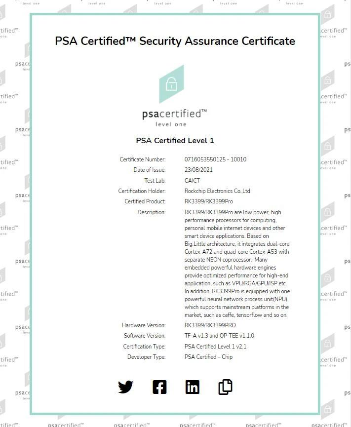 瑞芯微 RK3399pro及RK3399 芯片正式通過Arm平臺安全架構PSA Level 1認證,支持基于PSA框架的IoT物聯網及邊緣計算解決方案高效部署,幫助終端合作伙伴提升設備的數據安全性及可靠性。