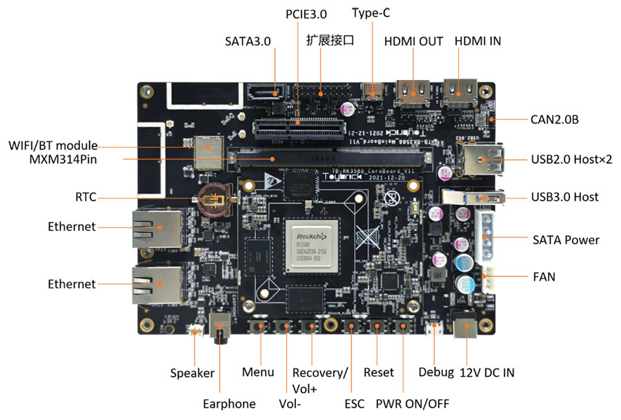 底板擁有豐富的外圍接口,包括HDMI2.1/MIPI/eDP/DP/HDMI in等顯示接口,HDMI/喇叭/耳機/麥克風等音頻接口,雙千兆以太網接口,以及支持雙頻WIFI 6/BT 5.0 無線網絡接口和USB2.0/USB3.0/SATA3.0/PCIe3.0/Can2.0等接口。核心板與底板之間,通過MXM314Pin標準接口相連,可擴展性強,可極大程度地發揮RK3588的性能優勢。
