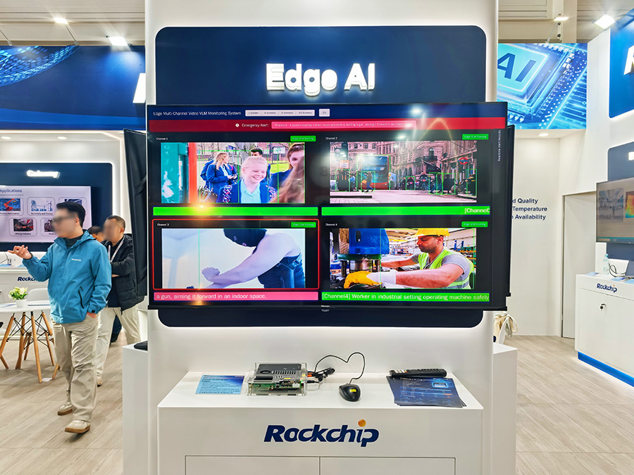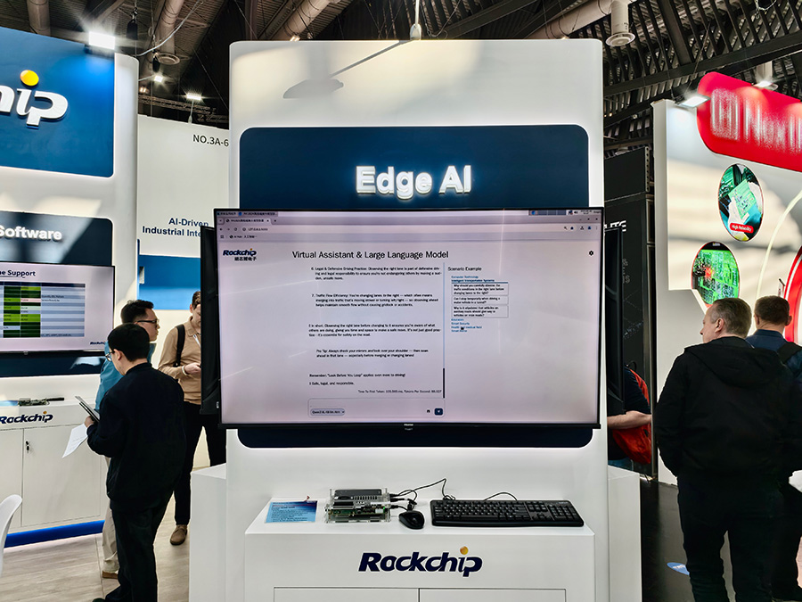 端側(cè)AI展區(qū)重點(diǎn)展示了旗艦SoC RK3588 與新一代3D架構(gòu)端側(cè)算力協(xié)處理器 RK1828 的技術(shù)能力,直擊AIoT2.0工業(yè)場景對(duì)低延遲、高隱私、強(qiáng)算力的核心需求。