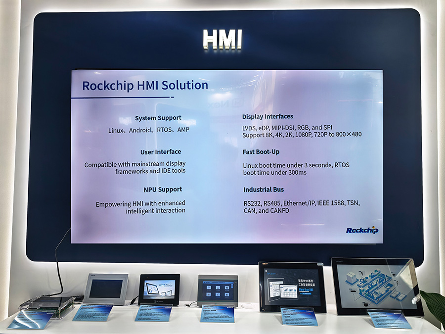 • 工業(yè)HMI:現(xiàn)場聯(lián)動(dòng)的六款不同品牌HMI終端及Web人機(jī)界面,搭載了從輕量RK3506J、PX30K到高性能RK3568J、RK3588J系列方案。輕量化RK3506J HMI方案在工業(yè)HMI及控制領(lǐng)域已成熟商用,支持快速啟動(dòng)顯示UI(Linux系統(tǒng)2.5秒內(nèi),RTOS系統(tǒng)0.6秒內(nèi)),滿足工業(yè)設(shè)備快速響應(yīng)的需求如醫(yī)療設(shè)備、自動(dòng)化產(chǎn)線等。