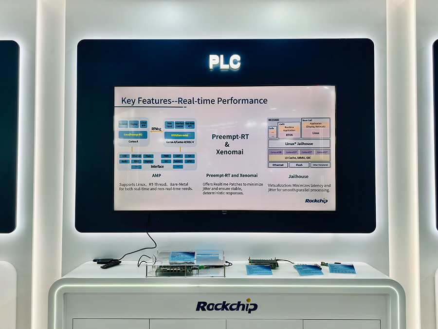 • PLC與運(yùn)動(dòng)控制:在工業(yè)控制核心的PLC領(lǐng)域,基于RK3506的PLC、RK3568J的運(yùn)動(dòng)控制卡,以及首次亮相的RK3572 Linux實(shí)時(shí)系統(tǒng)方案(支持多核異構(gòu)系統(tǒng)部署),向業(yè)界展示了瑞芯微在實(shí)時(shí)性上的極致打磨。RK3576J搭配FPGA的多路AD采集處理方案,為高精度工業(yè)現(xiàn)場控制提供了國產(chǎn)優(yōu)選路徑。