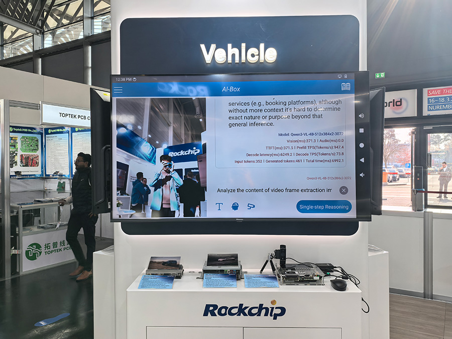 汽車展區(qū)重點(diǎn)展出了最新的AI BOX方案,基于RK3588+RK1828架構(gòu),致力于為用戶打造低延遲、快響應(yīng)的全離線智能交互體驗(yàn)。該方案在保護(hù)用戶數(shù)據(jù)隱私的前提下,支持文本、圖文、視頻、語音等多種模態(tài)的推理任務(wù),通過算力擴(kuò)展,可實(shí)現(xiàn)艙內(nèi)外視覺場景智能識(shí)別,如前車識(shí)別、交通標(biāo)志實(shí)時(shí)解讀、眼動(dòng)追蹤、兒童危險(xiǎn)感知、空間手勢感知、停車哨兵等功能。
